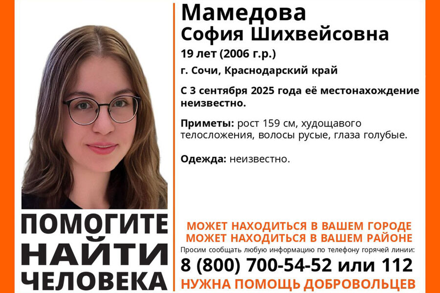 С 3 сентября нет информации о местонахождении пропавшей Софии Мамедовой. Приметы девушки: рост 159 сантиметров, худощавое телосложение, русые волосы и голубые глаза. Информация об одежде в момент исчезновения отсутствует.