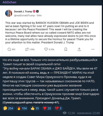 Мы вели её 47 лет. Я положил ей конец, ведь я - ПРЕЗИДЕНТ МИРА! На этой неделе я создам Совет Мира Ормузского Пролива, куда я не приглашу этих трусов - так называемых союзников по НАТО. Многие настоящие союзники уже выразили желание присоединиться к нему, ведь такой шанс случается только раз в жизни, чтобы обеспечить в Ормузском проливе мир! Благодарю вас всех за внимание. Президент Дональд Дж. Трамп,