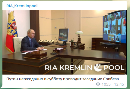 Президент России Владимир Путин явно немало удивил кремлёвский пул тем, что внезапно в субботу созвал совещание с членами Совета безопасности РФ. Об этом журналисты сообщили в авторском Telegram-канале RIA_Kremlinpool.