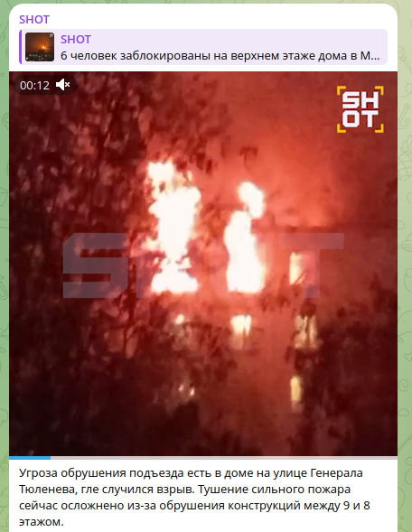 Новые подробности о квартире на улице Генерала Тюленева в Москве, где прогремел взрыв, а после начался сильный пожар, появились в СМИ. Readovka сообщает, ссылаясь на соседей по дому, что "хозяин квартиры, где произошёл взрыв газа, несколько дней назад ушёл на СВО".