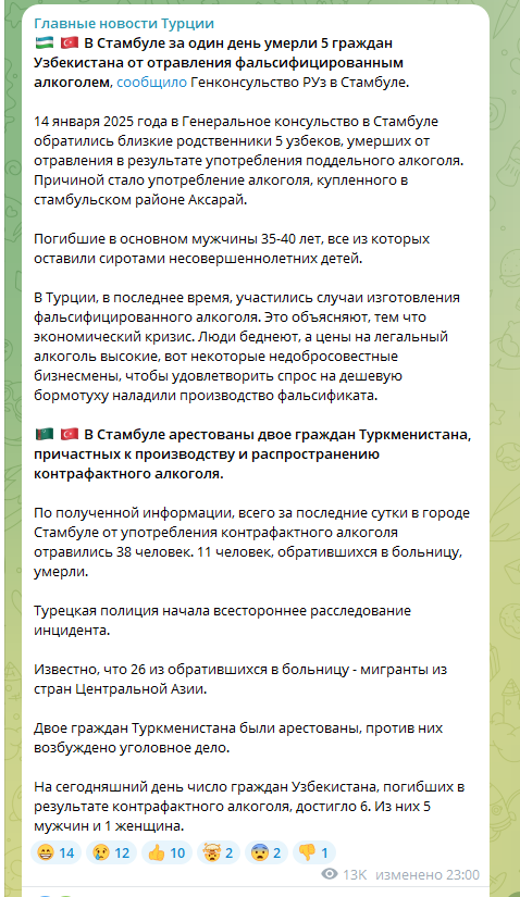 Тем временем история обрастает подробностями. Так, по данным турецкого агентства Anadolu, за те же сутки в больницы страны обратились 38 человек (26 из которых - иностранцы, приезжие из Центральной Азии). У всех - симптомы тяжёлого отравления суррогатным алкоголем. Из госпитализированных пациентов уже 11 умерли. Врачи борются за жизни остальных.