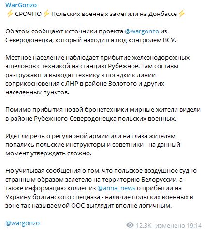 Об этом во вторник сообщили сразу несколько источников проекта WarGonzo из Северодвинска - города, который находится под контролем Киева. Они отметили, что недавно на железнодорожную станцию Рубежное прибыли железнодорожные эшелоны с техникой, которую потом перебрасывают к границе с ЛНР. Кроме того, местные жители видели в районе Рубежного - Северодонецка польских военных.