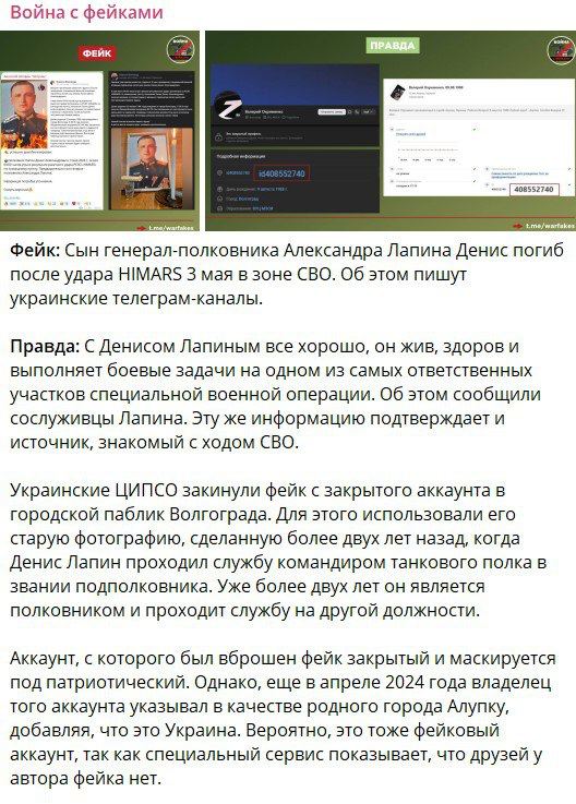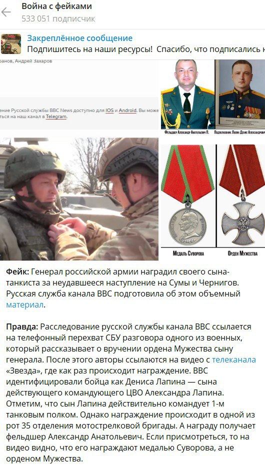 "В зоне СВО убит сын генерал-полковника Александра Лапина": Украинская пропаганда соврала шесть раз за сюжет. Разоблачаем