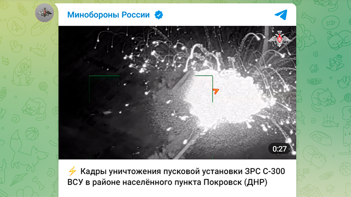 9 марта Министерство обороны опубликовало кадры удара ракетой оперативно-тактического комплекса "Искандер" по колонне машин, в составе которой был идентифицирован зенитный комплекс С-300. Колонна была подловлена на марше в окрестностях села Сергеевка, к западу от Покровска.