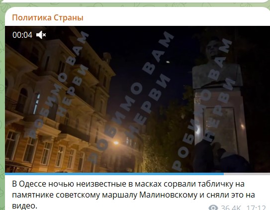 В Одессе неизвестные сорвали табличку на памятнике советскому маршалу Малиновскому.