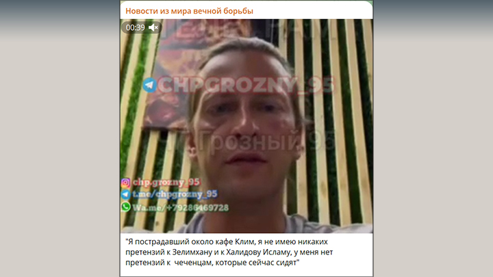 Это не извинение. Он говорит, что не имеет претензий к тем двум чеченцам, и говорит, что его избивали охранники заведения,