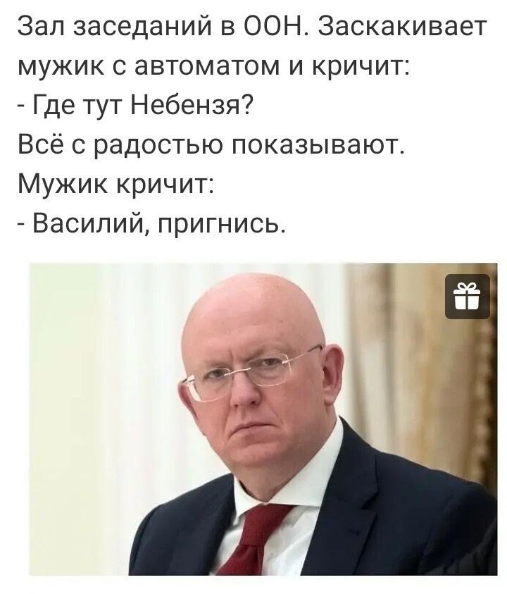 Начинается анекдот с того, что идёт заседание ООН. Внезапно в зал врывается человек с автоматом и наставляет оружие на дипломатов, требует показать, кто среди них - Небензя. Дипломаты радостно на него указывают.