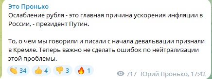 Юрий Пронько в своём телеграм-канале отметил: в Кремле наконец признали, что ослабление рубля это главная причина того, что инфляция в стране ускоряется.
