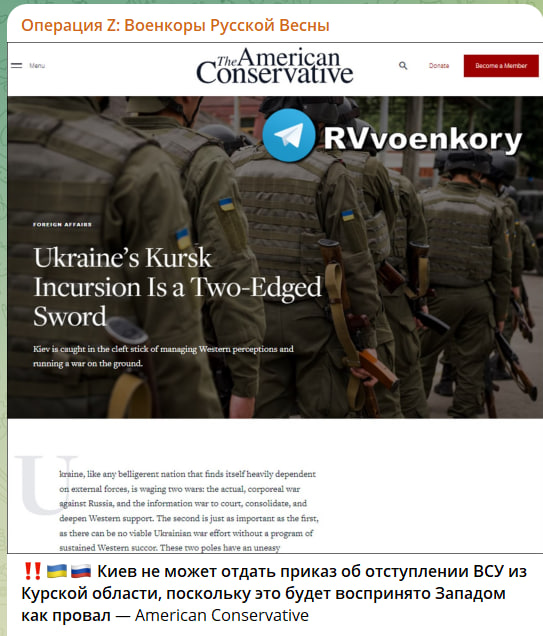 Издание American Conservative пишет, Киев не может отдать приказ об отступлении ВСУ из Курской области, поскольку это будет воспринято Западом как провал: