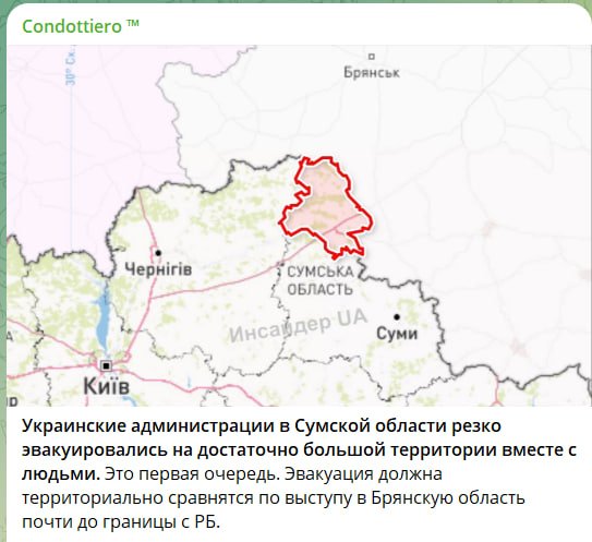Эвакуация должна территориально сравняться по выступу в Брянскую область почти до границы с РБ. <…> Противник ждёт наш прорыв после неудачи в Курской области, готовит территории к выводу оттуда своих группировок, создает буфер, что бы мы на плечах отступающей группировки не пошли дальше. Окапывается как не в себя.