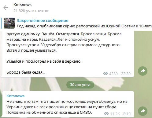 "Не знаю, кто там что пишет по "состоявшемуся обмену", но на Украине даже не всех россиян еще свезли на пункт сбора. Половина из обменного списка еще в СИЗО".