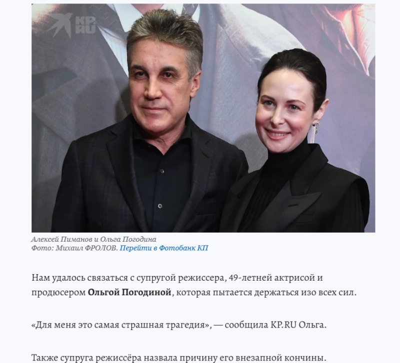 Вдова Алексея Пиманова Ольга Погодина впервые высказалась о трагедии, внезапно обрушившейся на семью, публично. В разговоре с журналистами прозвучало горькое признание: "Самая страшная трагедия". Пиманов ушёл неожиданно – всегда подтянутый, моложавый, энергичный, он никогда не сетовал на здоровье. Во всяком случае, во всеуслышание. Близкие говорят, что режиссёр и телеведущий был полон планов, всё оборвалось неожиданно.