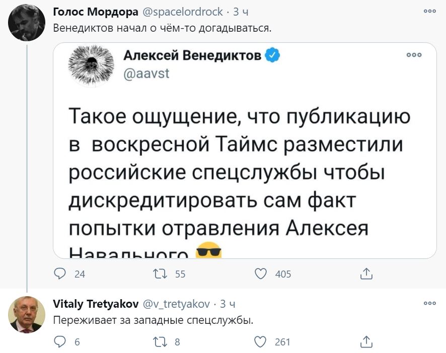 Главред "Эха" опубликовал твит, в котором предположил, что публикацию в The Times разместили российские спецслужбы, "чтобы дискредитировать сам факт попытки отравления Алексея Навального".