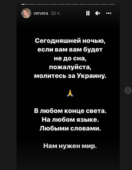 Своё обращение к поклонникам известная певица Вера Брежнева оставила в сторис Instagram. Поп-исполнительница попросила фанатов "сегодняшней ночью" (если им "будет не до сна") помолиться за Украину.
