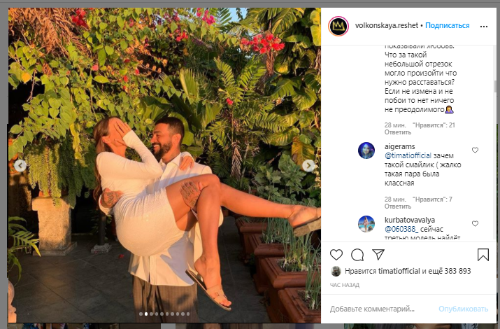 Фолловеры завалили Анастасию сочувственными комментариями, самым популярным стал комментарий самого Тимати: рэпер лаконично оставил под постом сердечко. Его начали умолять сохранить семью: "Верни её!", "Почему бросаешь всё на полпути? Эти кризисы нужно преодолевать", "Жалко, такая пара классная была".