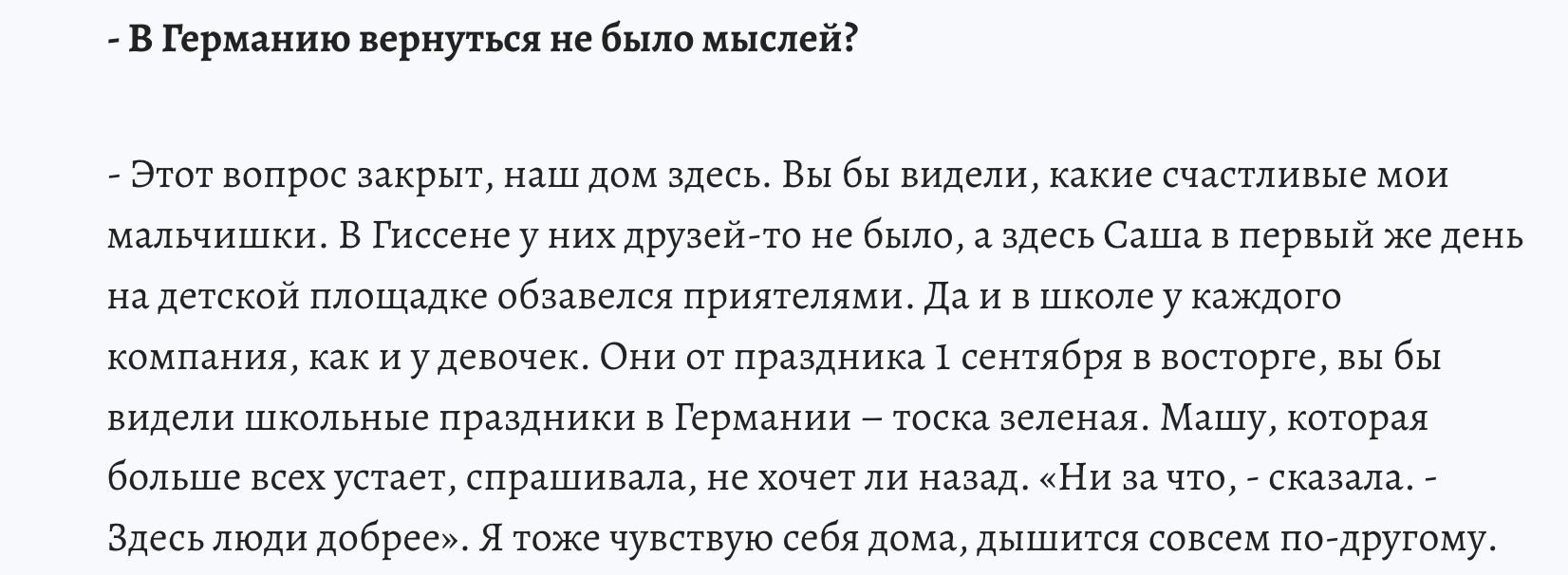Мать четверых детей быстро осознала, что европейская жизнь не подходит ей, и решила поменять пятикомнатный дом в Германии на однокомнатную квартиру в России. После 20 лет проживания за рубежом героиня истории решила бросить всё и вернуться на Родину.