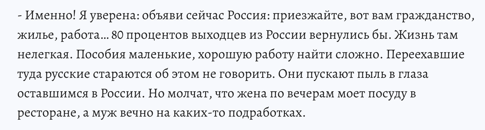 Ольга также утверждает, что рай в Европе - это миф. Те, кто уехал в Европу, надеются на пособия, которые, конечно, существуют. Там есть социальное жильё. Но она уверена, что условия проживания в России гораздо лучше. Пособия предназначены только для того, чтобы не умереть с голоду. Люди вынуждены питаться самой дешёвой едой и носить одежду из секонд-хенда.
