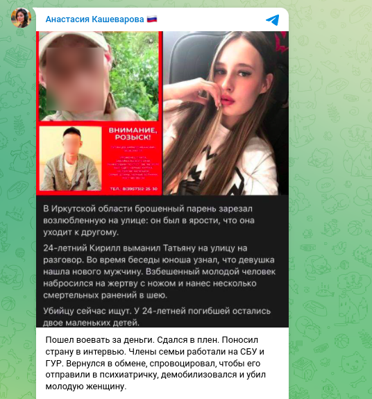 18 декабря в городе Свирск Иркутской области было обнаружено тело 24-летней девушки. Мама двух мальчиков была зверски убита - причиной смерти стали многочисленные колото-резаные ранения. Все улики быстро указали на её сожителя. Спустя три дня, 21 декабря, вернувшийся из плена контрактник, 24-летний Кирилл Путинцев, был задержан по подозрению в совершении этого преступления. Его арест обнажил историю, далёкую от образа защитника Отечества, и заставил многих в недоумении задаться вопросом: и этого человека называли героем СВО?