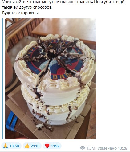 "По чистой случайности и благодаря сознательности офицеров, отставивших анонимный торт и алкашку в сторону, никто тупо не успел ни торт съесть, ни алкашку затестить. Торт даже успели уже порезать. Это была бы катастрофа. 77 гостей. Все живы. ГУР в этот раз … (провалило свою задачу. - Ред.) полностью. И это хорошо", - отметил автор канала.