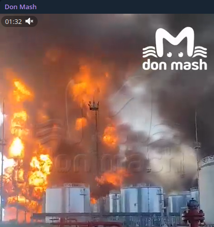 В городе Пролетарск в Ростовской области продолжает полыхать нефтебаза, на которой вспыхнул пожар после атаки дрона ВСУ. Огонь не могут потушить уже больше суток, из-за чего весь населённый пункт заволокло чёрным дымом.
