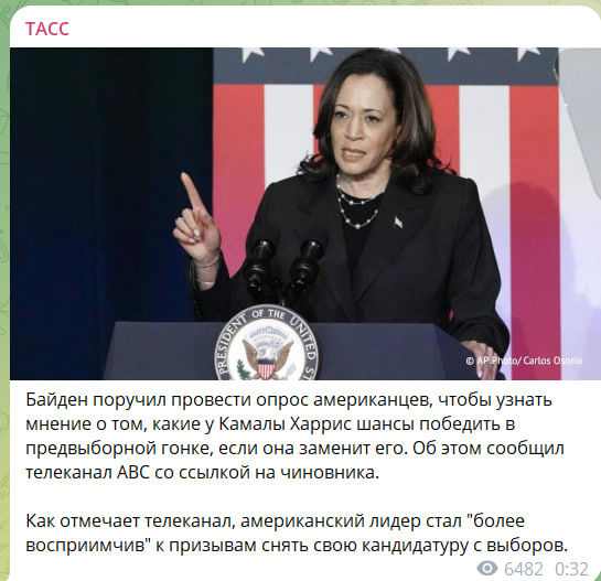 В то же время телеканал сообщил, что Байден поручил провести опрос американцев, чтобы узнать мнение о том, какие у Камалы Харрис шансы победить в предвыборной гонке, если она заменит его.
