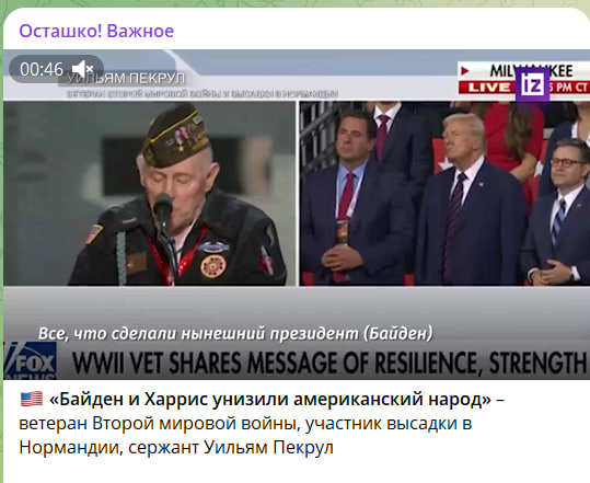 Участник высадки в Нормандии сержант Уильям Пекрул поднялся на трибуны во время митинга в поддержку Трампа и вместо того, чтобы хвалить экс-президента, сосредоточился на критике действующей власти.