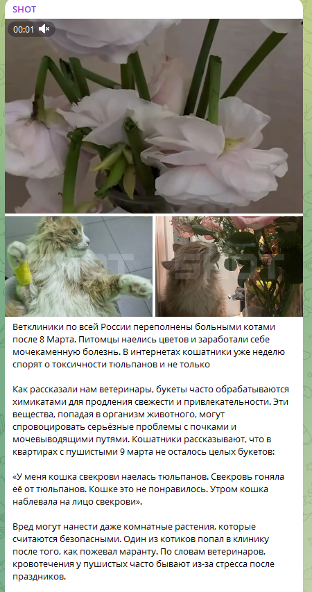 Итог – по всей России ветклиники переполнены животными, пострадавшими от дегустации букетов. Всё потому, что вместе с листьями и цветами в организм котов попали ядовитые химикаты.