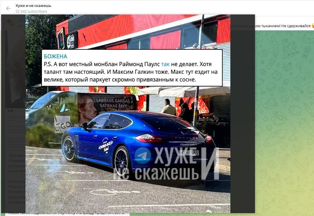 По информации из "надёжных источников", Укупник в Юрмале разъезжает на шикарных автомобилях и паркуется прямо на местах для инвалидов. Скриншот: телеграм-канал "Хуже и не скажешь"