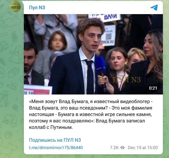 "Влад Бумага записал коллаб с Путиным": Изящный укол кремлёвского пула в адрес блогеров на "Итогах года"