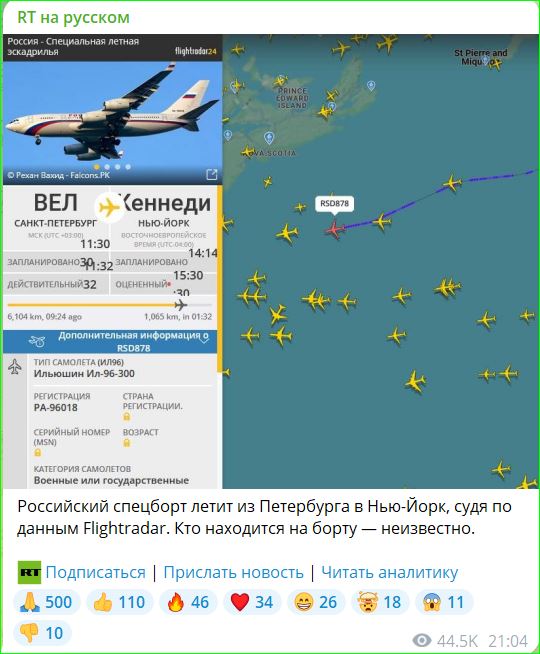 Вылетевший из аэропорта Пулково в Санкт-Петербурге в 11:32 мск. русский спецборт Ил-96-300 с регистрационным номером RSD878 совершил посадку в международном аэропорту имени Джона Кеннеди в Нью-Йорке в 22:28 мск. В 21:10 по Москве информация об этом полете разлетелась по соцсетям, вызвав бурю обсуждений.