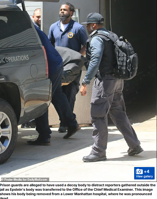 Настоящее тело Эпштейна тем временем погрузили в чёрный автомобиль, который незаметно покинул территорию тюрьмы.
