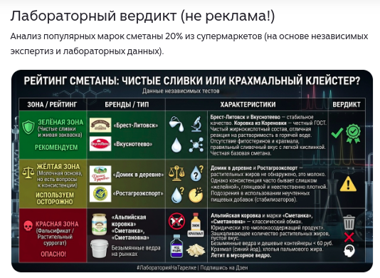 В "красную зону" попал откровенный фальсификат, не имеющий права называться сметаной. По мнению авторов дзен-канала, туда вошли марки "Альпийская коровка" и "Сметанка" и "Сметановна". Справедливости ради стоит отметить, что товары брендов маркированы не как сметана, а как сметанный продукт.