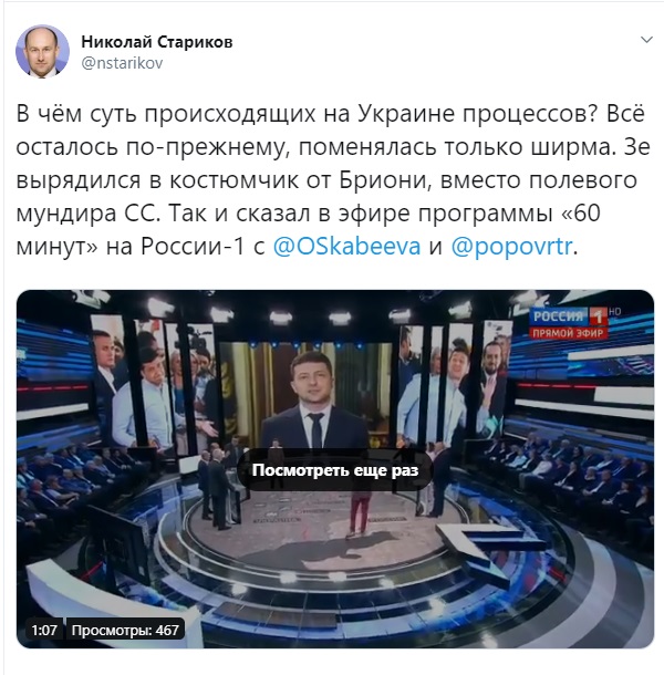"В чём суть происходящих на Украине процессов? Всё осталось по-прежнему, поменялась только ширма. Зе вырядился в костюмчик от Бриони вместо полевого мундира СС", - жестко высказался Стариков.
