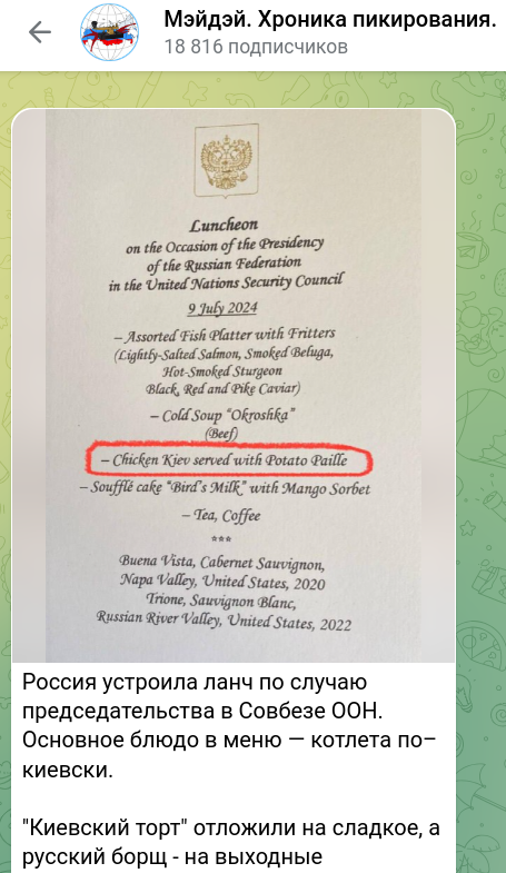 С 1 июля и до конца текущего месяца Россия председательствует в Совете Безопасности ООН. В честь этого события дипломаты устроили ланч, который уже успел возмутить украинскую делегацию. Дело в том, что главным блюдом в меню оказалась "котлета по-киевски". Украинцы тут же усмотрели в этом намёк на их незавидное положение на фронте. И, вероятно, неспроста. Умеют наши дипломаты изящно намекнуть. Вполне возможно, что подборка яств действительно имела цель тонко указать противнику на будущий финал СВО.