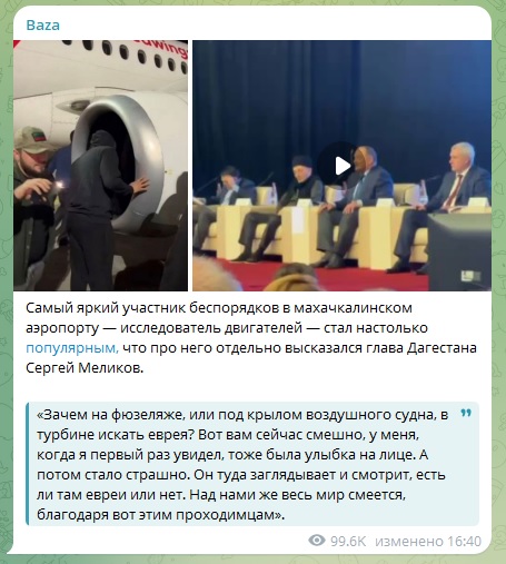 Глава Дагестана Меликов прокомментировал видео "поиска евреев" в турбине самолёта в аэропорту Махачкалы. "Когда я первый раз увидел, тоже была улыбка на лице. А потом стало страшно", - отметил руководитель региона.