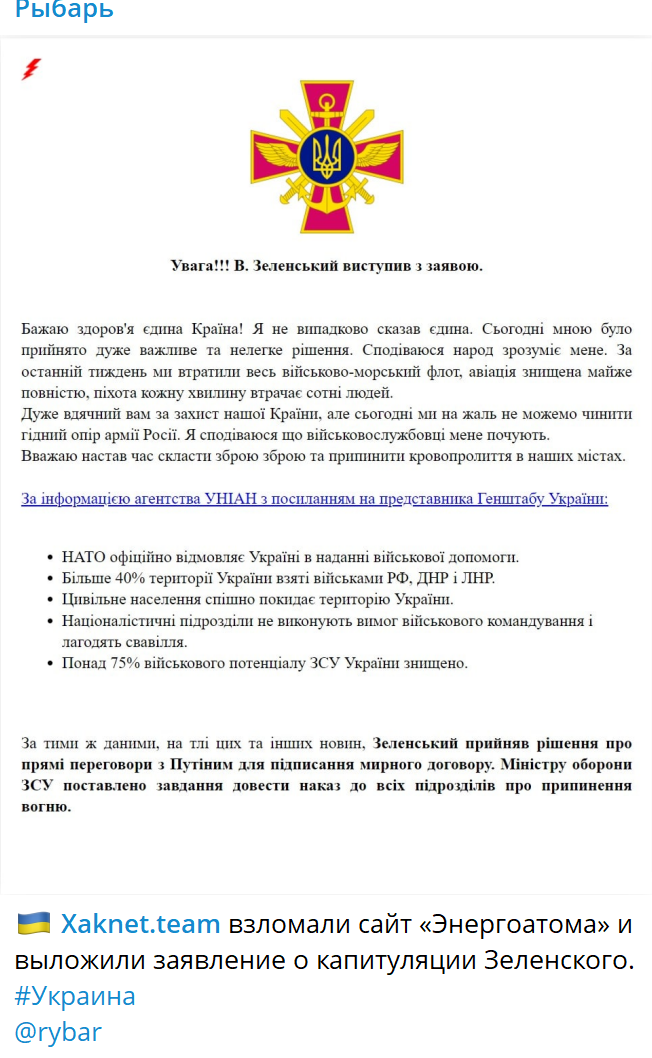 Хакеры на сайте "Энергоатома" выложили фейковое обращение Зеленского.