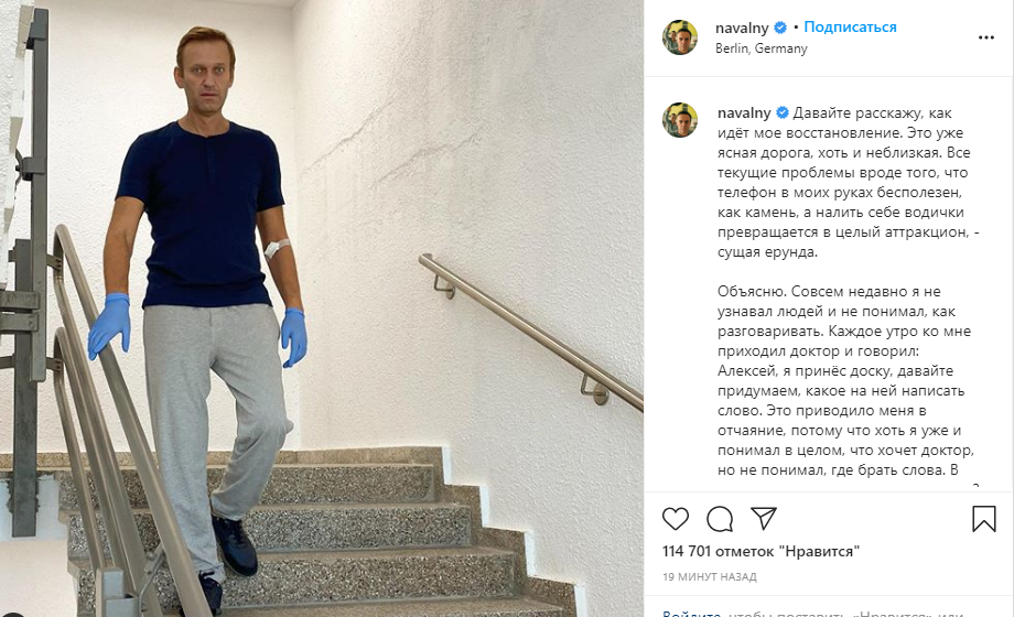 На своей странице в Instagram Навальный рассказал подписчикам о своём нынешнем состоянии, прикрепив к посту фото из больницы. К слову, стоит отметить, что "отравленный" "боевым веществом" блогер спокойно прогуливается по лестницам больницы без чьей-либо помощи и без какой-либо защиты для окружающих.