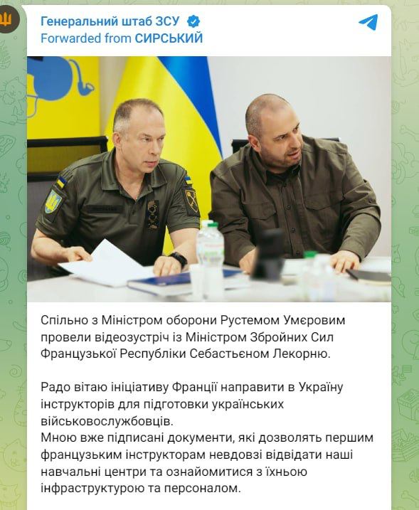 Ранее пресс-служба Генштаба ВСУ распространила информацию о подписании договора между Парижем и Киевом, согласно которому французским военным инструкторам даётся разрешение на посещение учебных центров на Украине для подготовки новых боевиков ВСУ. Также главком ВСУ Сырский приветствовал "инициативу Франции направить на Украину инструкторов".