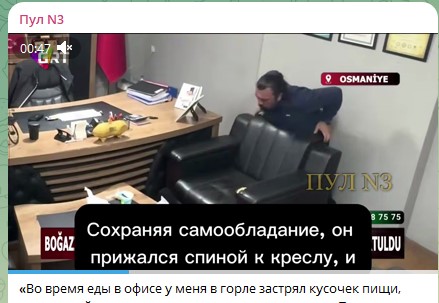 В Турции подавившийся едой врач избежал смерти, сделав сам себе приёма Геймлиха. Медик использовал спинку кресла, чтобы резко надавить в область живота и вытолкнуть застрявший кусок еды.