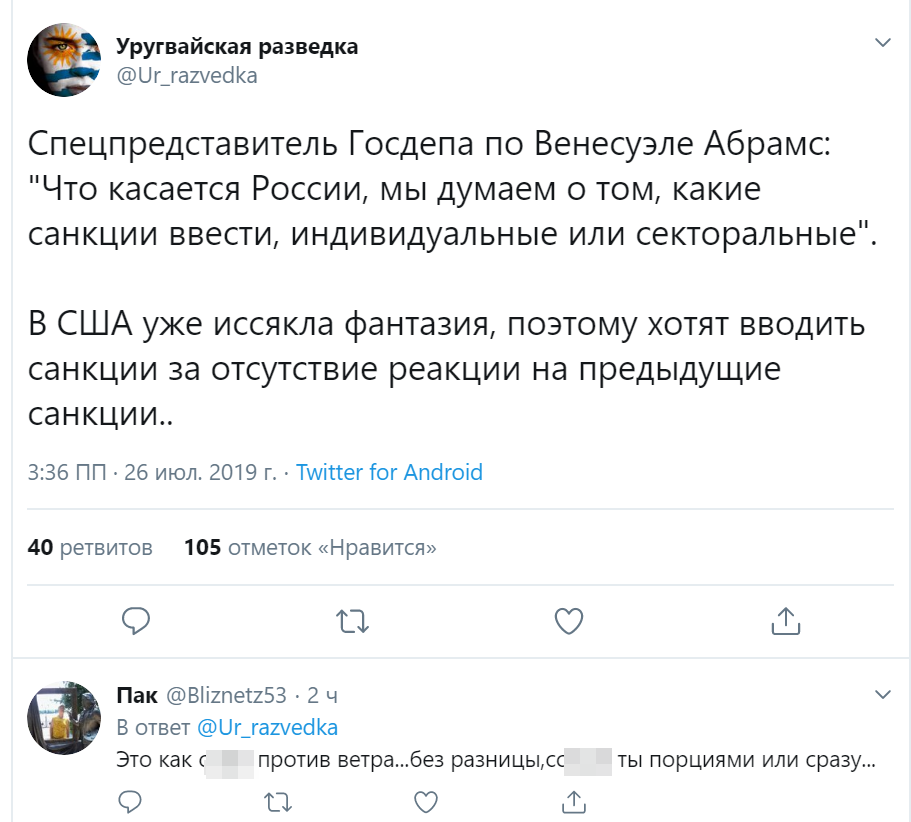 "Спецпредставитель Госдепа по Венесуэле Абрамс: "Что касается России, мы думаем о том, какие санкции ввести, индивидуальные или секторальные". В США уже иссякла фантазия, поэтому хотят вводить санкции за отсутствие реакции на предыдущие санкции", - отмечает пользователь Twitter под ником Ur_razvedka.