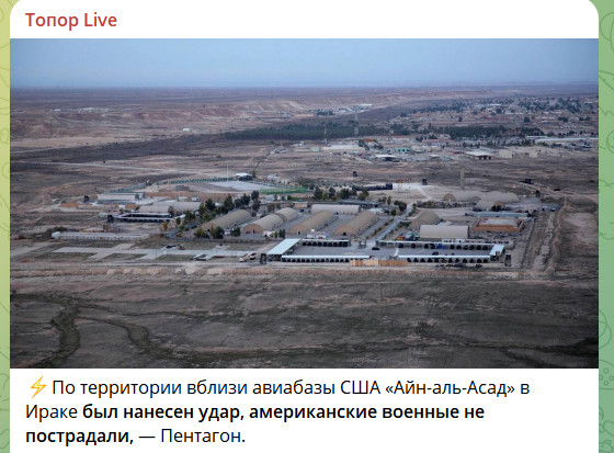 Агентство Reuters сообщило, что американская военная база Айн-аль-Асад в провинции Анбар на западе Ирака атакована четырьмя самодельными неуправляемыми ракетами малой дальности. Как пишет life.ru, впоследствии представители Пентагона в беседе с корреспондентами РИА "Новости" подтвердили, что действительно был нанесён ракетный удар, но отметили, что никто из-за этого не пострадал.
