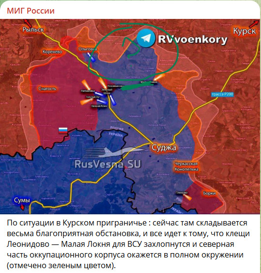 Между тем в Курском приграничье сейчас складывается весьма благоприятная для нас обстановка. Всё идёт к тому, что клещи Леонидово - Малая Локня для ВСУ захлопнутся и северная часть оккупационного корпуса окажется в полном окружении (отмечено зелёным цветом). Уже сейчас там у ВСУ серьёзные проблемы с логистикой.