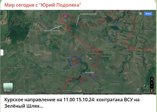 Вероятно, вследствие этого с утра сегодня пошла довольно сильная атака со стороны Свердликово (вдоль суджанской трассы). Логика понятна. Удастся занять Зелёный Шлях - во многом обнулятся наши здесь успехи. Участвуют до роты пехоты при поддержке нескольких танков. Пока это самая сильная из его контратак за всё время боёв с 10 октября. Идёт бой,