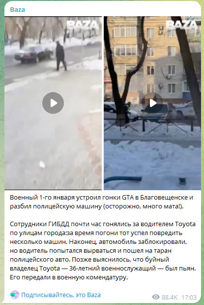 Визг колёс, тараны чужих машин и дерзкое бегство от сотрудников ГАИ. Некий военный 1 января, похоже, решил, что он бессмертный, и устроил жутковатые гонки в Благовещенске. Разбил даже полицейскую машину. Источник сообщает, что опасный нарушитель был задержан.