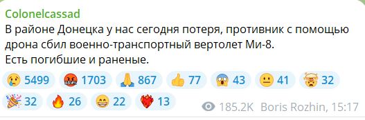 Сообщение Рожина подтвердил еще один околовоенный паблик "Воевода вещает". Со ссылкой на свидетелей телеграм-канал пишет, что по русскому вертолету Ми-8 попал выпущенный из РСЗО HIMARS снаряд.