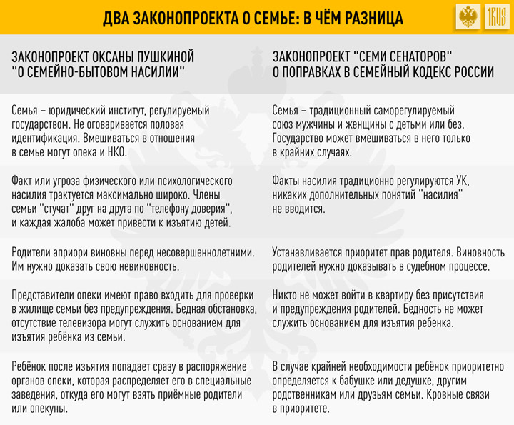 И эти попытки не прошли бесследно, найдя своё отражение в Семейном кодексе. С 2020 года развернулась борьба за внесение в законодательство изменений, защищающих традиционную семью. Пакет предлагаемых поправок и обрёл известность как "законопроект семи сенаторов". Однако противостояли семи сенаторам лоббисты ювенальной юстиции в лице на тот момент депутата Оксаны Пушкиной с группой... , назовём их, "сочувствующих". Тогда удалось не допустить принятия вредных предложений. В инфографике чуть ниже мы объясняем, в чём разница между предлагаемыми проектами законов.