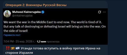 Ещё одна страна хочет выступить против Тегерана. Глава Народных сил обороны Уганды Мухузи Кайнеругаба официально заявил: его страна готова вступить в войну на стороне Израиля.