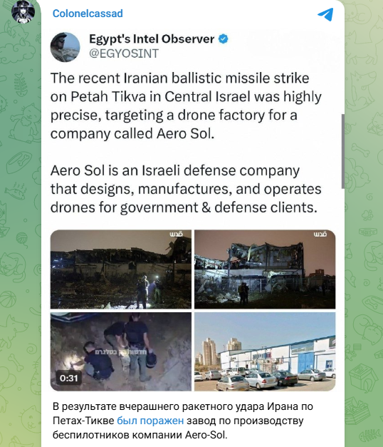 Израиль продолжает получать болезненные удары от Ирана. Так, вчера ракеты атаковали город Петах-Тиква, поразив завод компании Aero-Sol, где производят беспилотники.