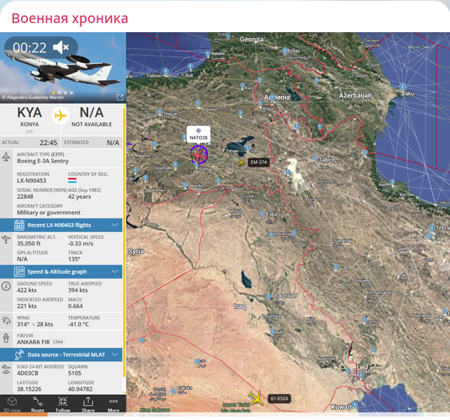 В эти минуты над Турцией работает AWACS E-3 Sentry с регистрацией Люксембурга LX-N90453. Параллельно на границе Турции с Ираном работают два беспилотника Bayraktar TB-2. Boeing E-3 Sentry оснащен радиолокационной станцией AN/APY-1 или AN/APY-2. Его возможности по обнаружению целей зависят от высоты полёта самого самолёта и типа цели. Благодаря импульсно-доплеровскому режиму, радар отсекает отражения от земли и может обнаружить цели на расстоянии до 400 км. Для объектов в свободном пространстве (выше горизонта) дальность обнаружения составляет около 650 км,