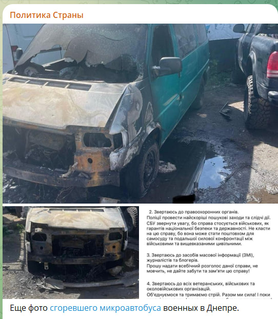 В ночь на 12 июня был дотла сожжён военный микроавтобус - издание "Страна" сообщает, что действовали четверо неизвестных. Произошло это в одном из районов Днепра. Один из военных уточнил, что на транспортном средстве было написано "Эвакуация ВСУ". Сам автомобиль прибыл на ремонт, однако теперь от него остался только металлический кузов.